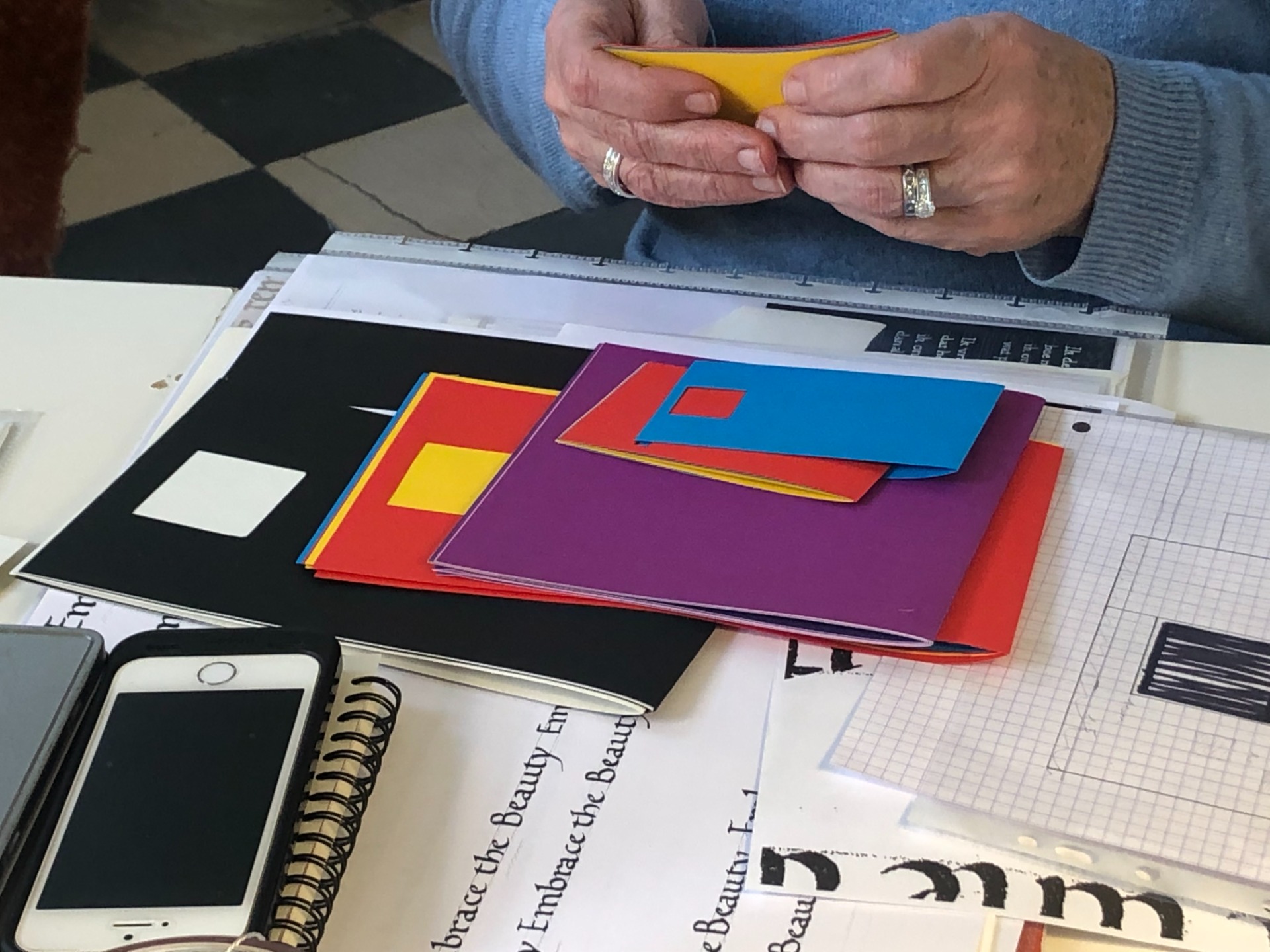We spelen met vormen door ze te knippen, plakken, scheuren en schuiven. We maken composities en vullen deze aan met geschreven en getekende letters.